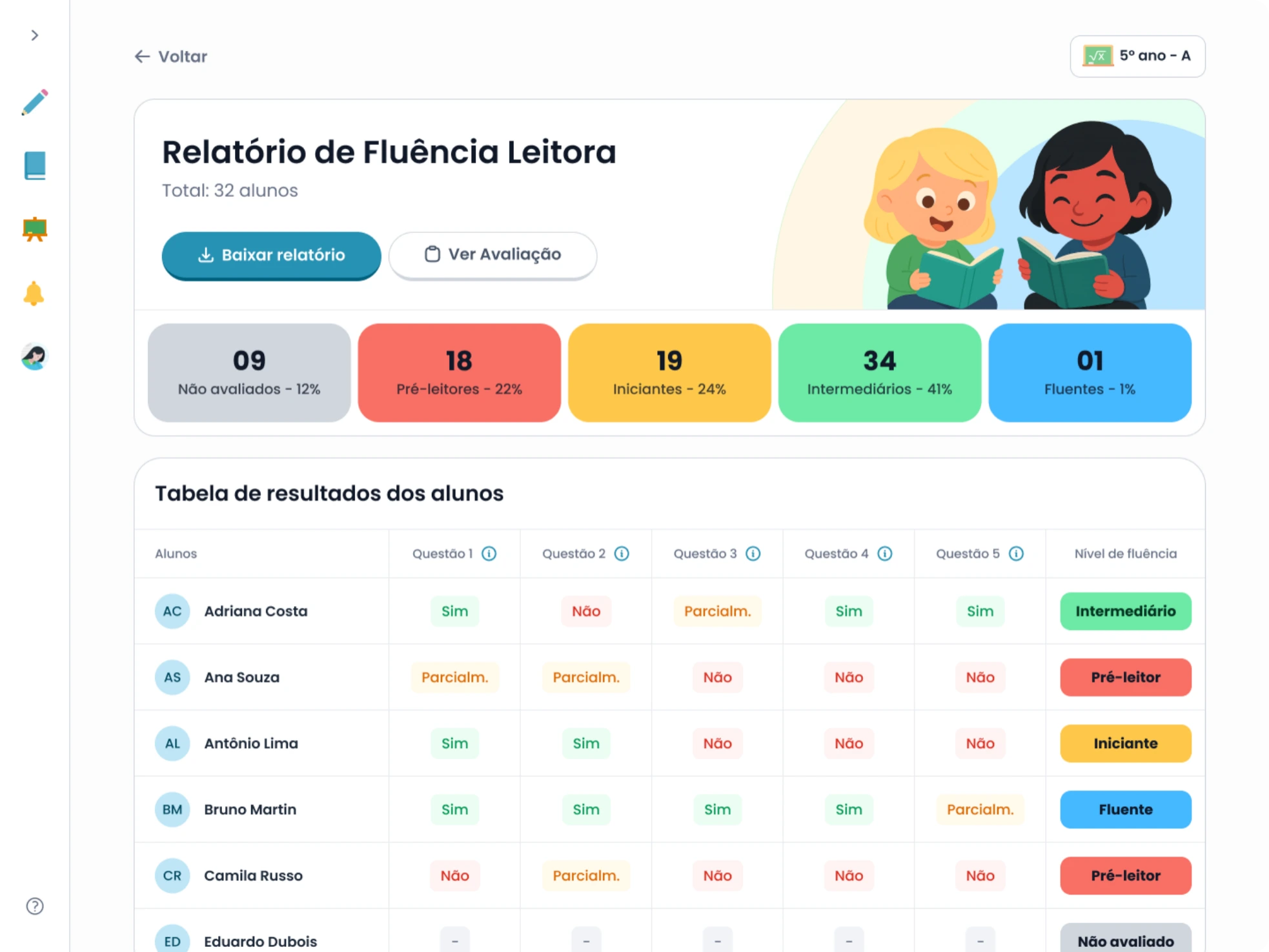 A EduQ oferece avaliações específicas para analisar o nível de fluência leitora de cada aluno, com indicadores claros e comparações de desempenho.